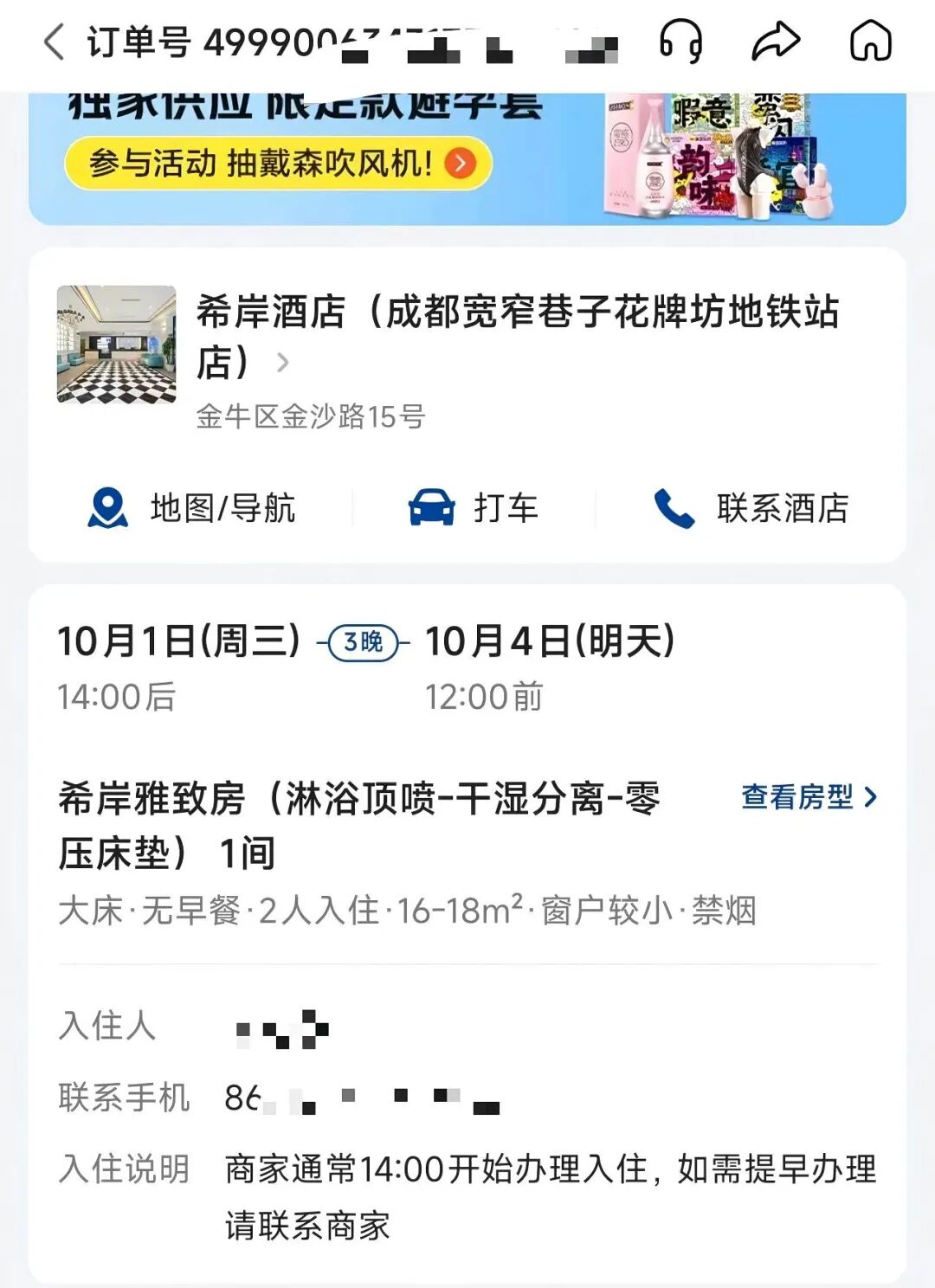 “我们是在网上预订的10月1日到10月4日的希岸酒店(成都市宽窄巷子花牌坊地铁站店)。”乔先生告诉记者,他们到店入住时是10月2日凌晨两点左右。